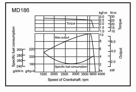 Kompakt pålidelig luftkølet dieselmotor med direkte indsprøjtning og effektivt luftrensningssystem. Motoren er udstyret med brændstoftank og manuel start. For dimensionsdata, se fig. nr. 2. Udgående aksel vandret og konisk se billede nr. 4 med dimensionsoplysninger på akseltap.