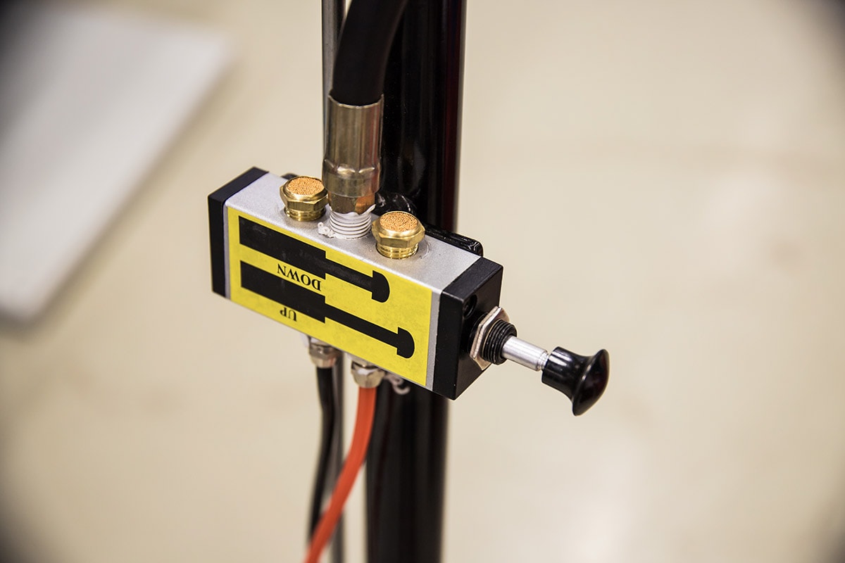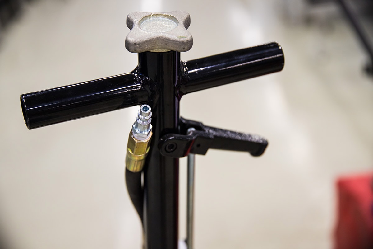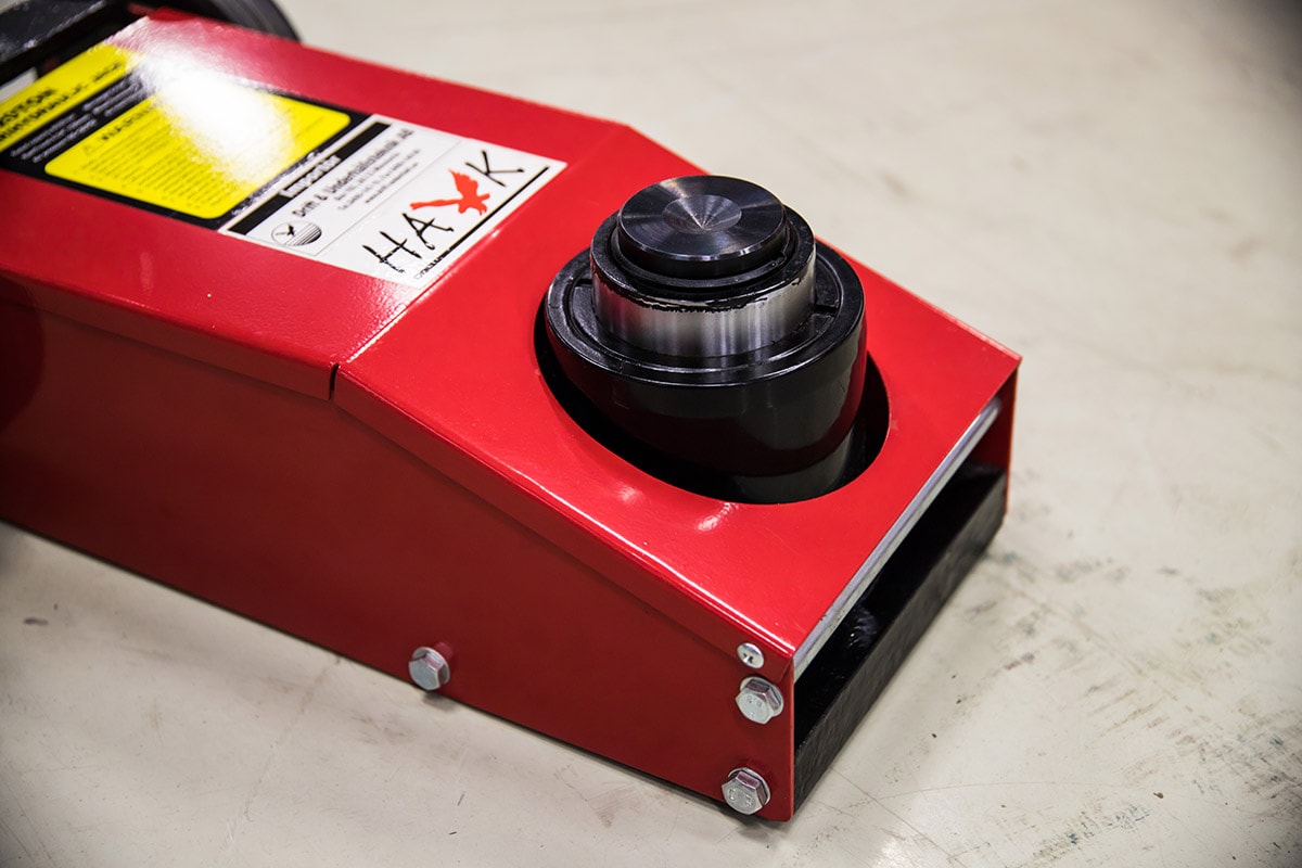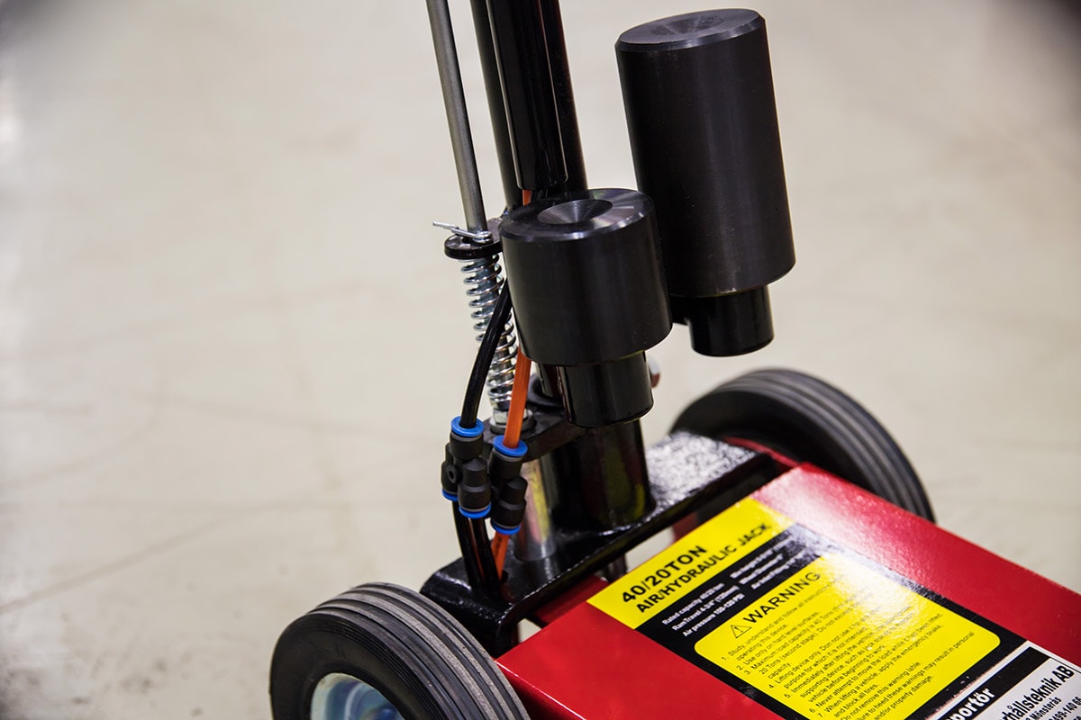 Tryckluftsdriven servicedomkraft för de tunga lyften. Tvåstegsfunktion och hjulburen. Domkraften levereras komplett med förlängare, 3 st adaptrar och ventil för höjning av kolven.