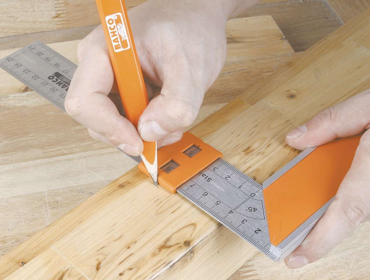 - Tømrervinkel med justérbar markør over måleskalaen, for nem at markere gentagne målinger