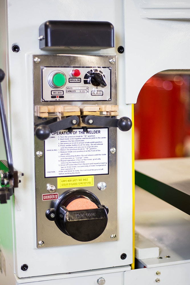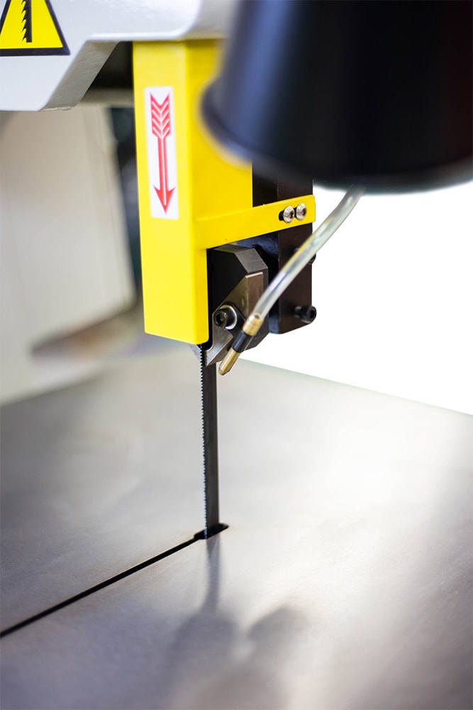 Vertikal metalbåndsav med variabel hastighed og støbejernsramme. Saven er udstyret med kraftig klingestyring, luftpumpe til spånblæsning, børste til rengøring og gummibelagte savhjul for det bedste saveresultat. Savens integrerede svejsedel gør, at du kan skære blade og svejse dem sammen igen, hvilket gør det muligt at save inde i et hul. Metalbåndsaven leveres med stødsvejsning, svejsesliber, båndskærer, 110-volt styresystem og belysning.