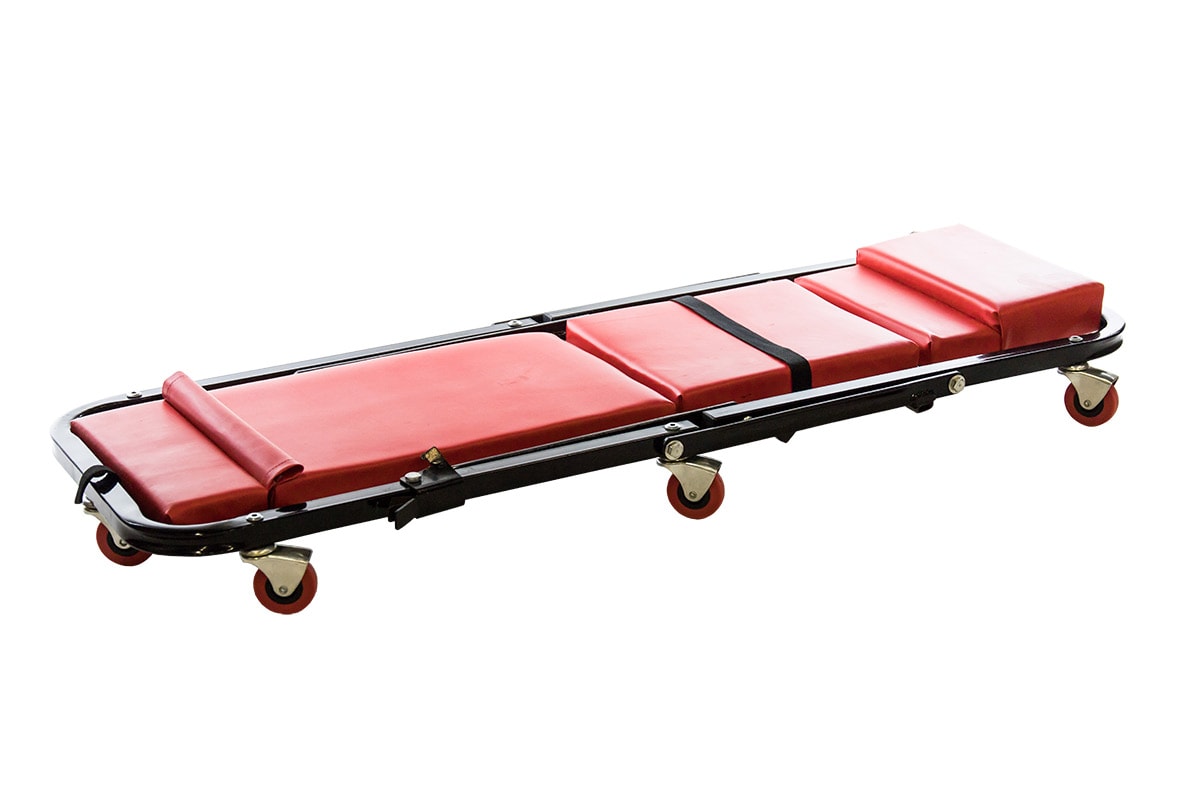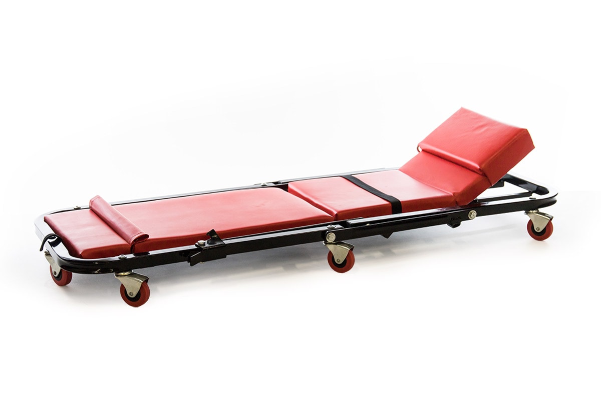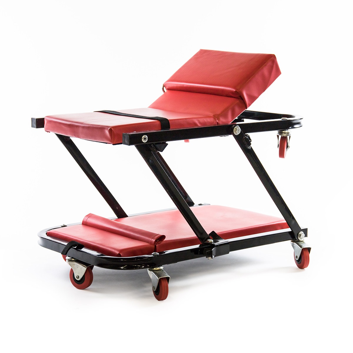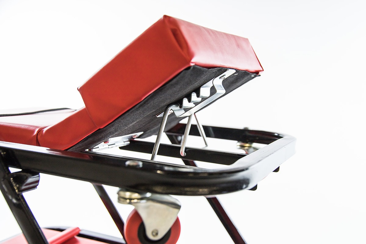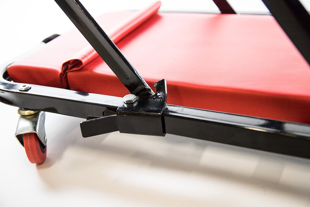 Monteringsvogn med blød polstring med nakkepude. Perfekt til autoværksteder, værksteder mv. Stabil ramme af firkantsprofiler. 6 drejelige hjul. Sædehøjde 400 mm.
