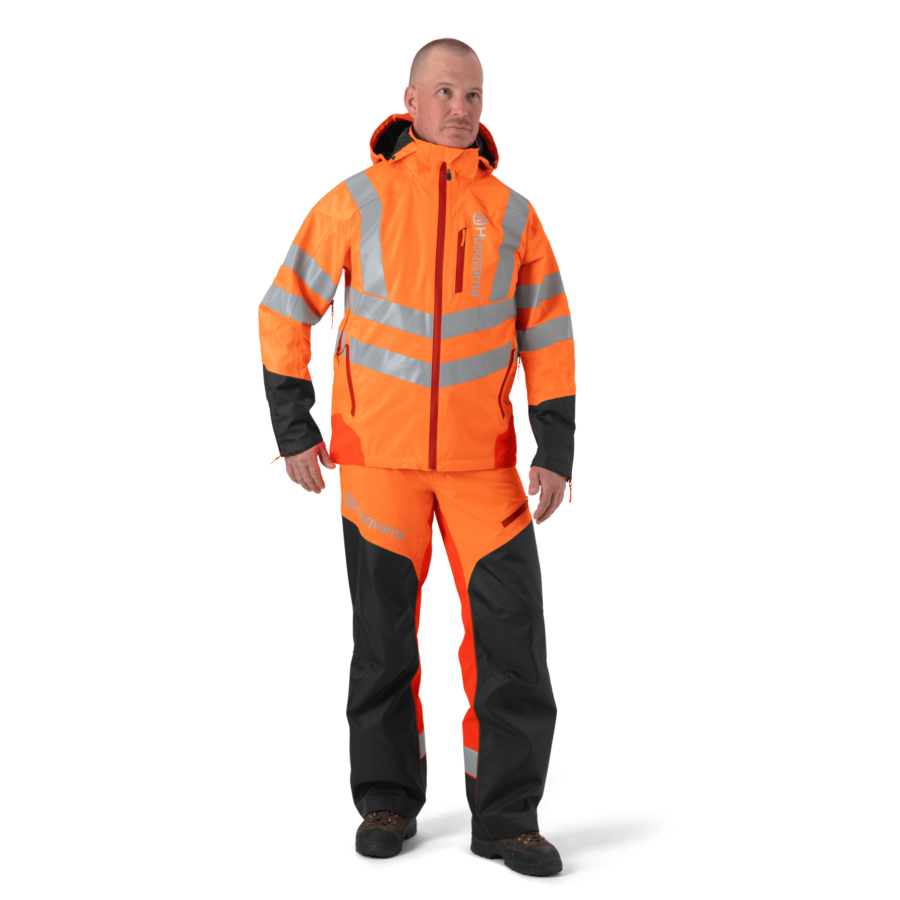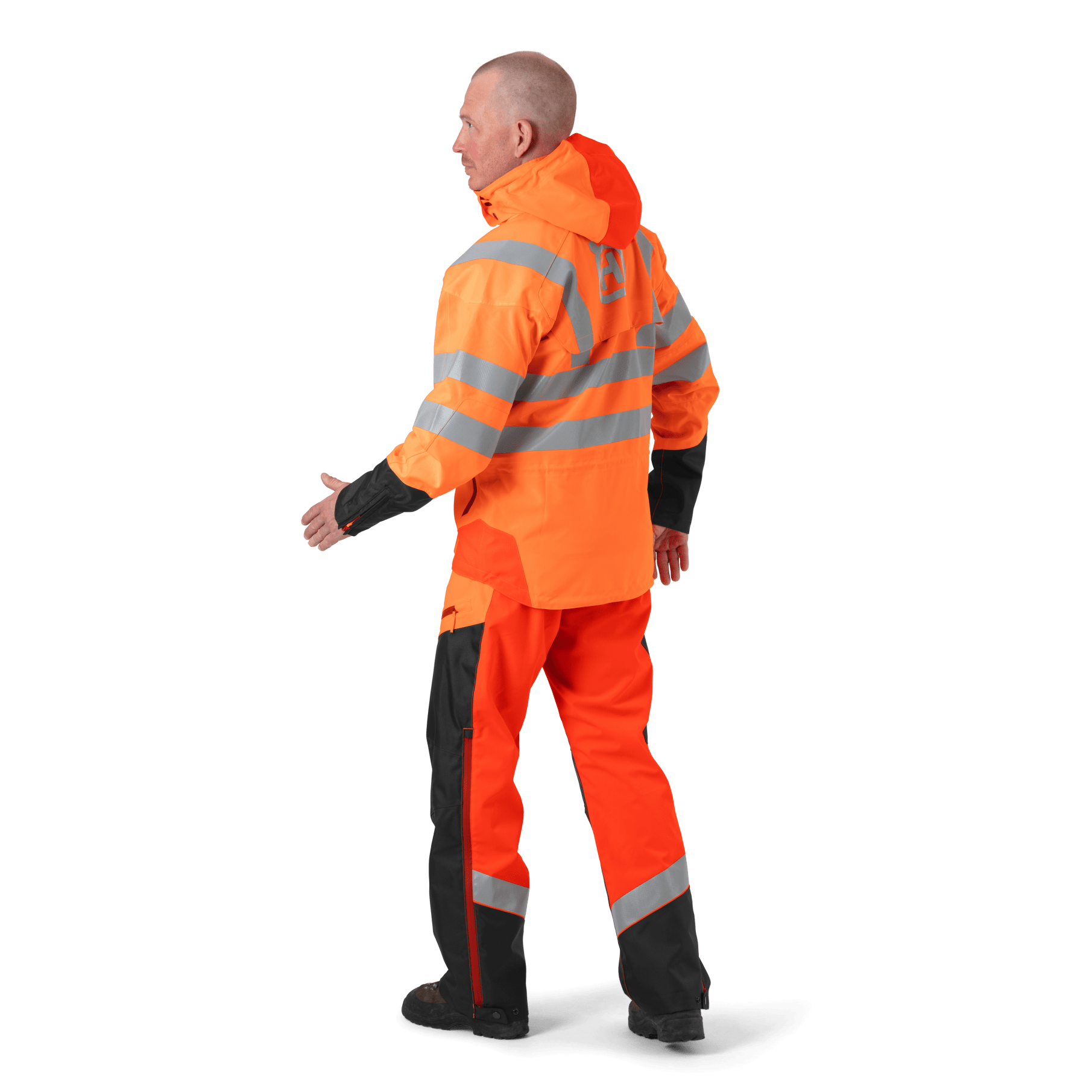 Regnjakke i høj kvalitet med forstærkning på ekstra udsatte steder. Vandafvisende og åndbar takket være lamineringsteknologi og tapede sømme. Lavet af holdbart polyester med stretch. Aftagelig hætte, justerbar talje og nedre kant for perfekt individuel tilpasning. Lommerne har vandtætte lynlåse for sikker opbevaring af ejendele. Godkendt ihht. EN ISO 20471 Klasse 3 og EN343. Fås i størrelse XS-XXL.