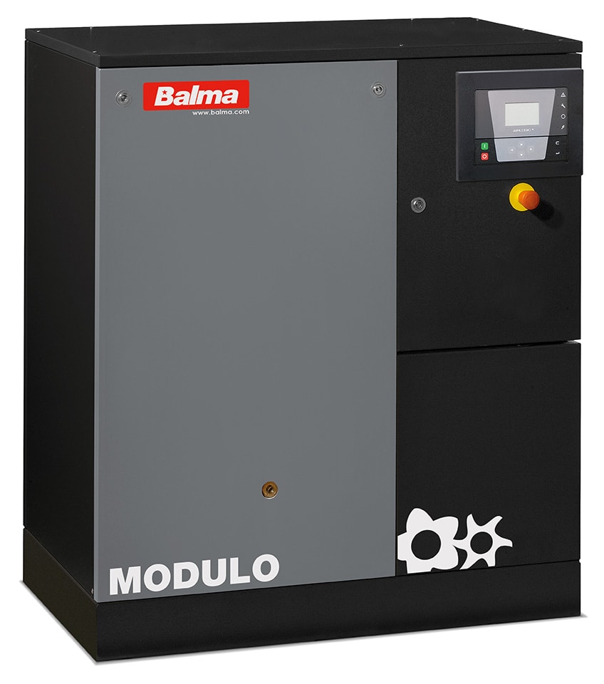 Den inverterstyrede skruekompressor Balma Modulo lever virkelig op til sit navn. Dette er en skruekompressor, der er tilpasset høje krav, hvor produktionen ikke må stå stille. Balma Modulo er som skruekompressor designet med arbejdsmiljøet for øje. Den er derfor udstyret med en rummelig isolering for at dæmpe lyden mest muligt, så det er muligt at placere skruekompressoren i nærheden af arbejdspladser, uden at blive forstyrret af lyden. Skruekompressoren er udstyret med en avanceret inverterteknologi, der varierer kompressorens hastighed for at spare så meget energi som muligt og forlænge kompressorens levetid. Denne model er udstyret med en køletørrer med en energieffektiv køletørrer, der bruger det organiske kølemiddel R134A. Maskinen har også et lydløst afløb, der kun dræner det kondenserede vand - og ingen luft som en konventionel afløbsventil. Inde i skruekompressoren er der også monteret et partikelfilter til krævende pneumatiske applikationer, der bortfiltrerer partikler op til 0,1 mikrometer. Balma Modulo er udstyret med kraftig køling med en turbine monteret på motorakslen i stedet for en konventionel ventilator for at skabe en mere effektiv køling af både olie og luft. Udover dette er der også en køling af motoren, som sikrer, at elmotoren altid arbejder ved den rigtige temperatur - selv i de mest krævende miljøer. Skruekompressoren er gennemtænkt i sin konstruktion, så det er nemt at udføre service; det mærkes ikke mindst på den udvendige oliestandsindikator, de let tilgængelige remme, oliefilter, luftfilter og separatorfilter. Som alle Balma skruekompressorer har denne maskine også lange serviceintervaller, hvorfor brugeren undgår unødvendig nedetid på grund af hyppige serviceintervaller.
