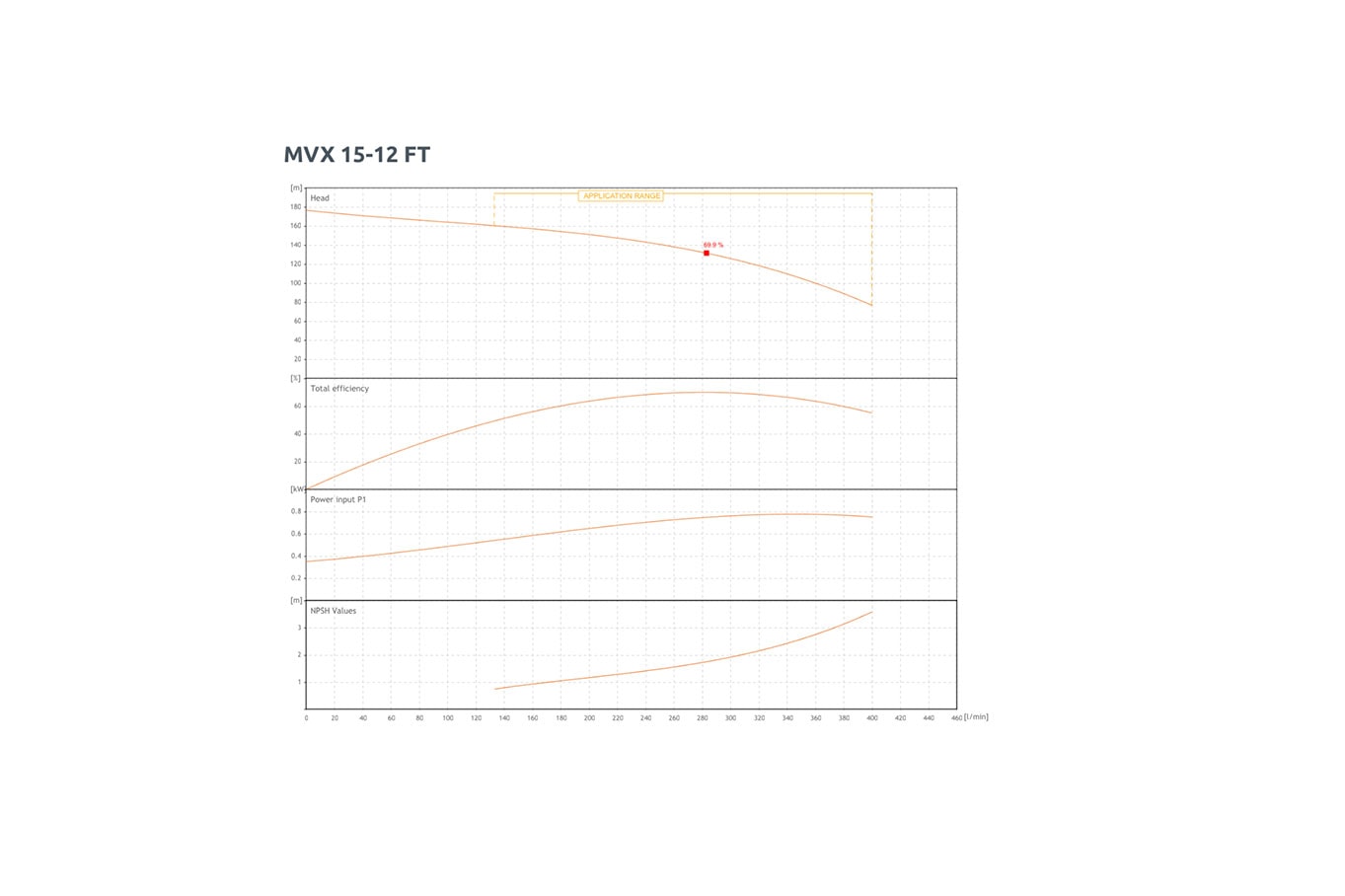 Centrifugalpumperne i MVX-serien er fremstillet fra 1,5 kW (2 hk) op til 15 kW (20 hk) med trykhøjder (H m) fra 30 til 270 meter og flow (Q) fra 45 til 500 l/min.